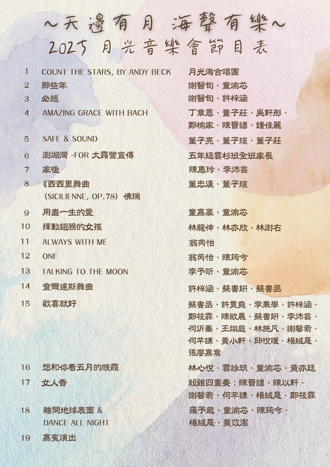 期待的中秋音樂晚會又來囉 ! 這一天也是我們全校大團圓的日子!這一夜天邊有月,海聲有樂,身邊有你我。讓我們帶著愉悅的心情,在草地上席地而坐、吃吃點心,一邊享受台上的表演吧 !