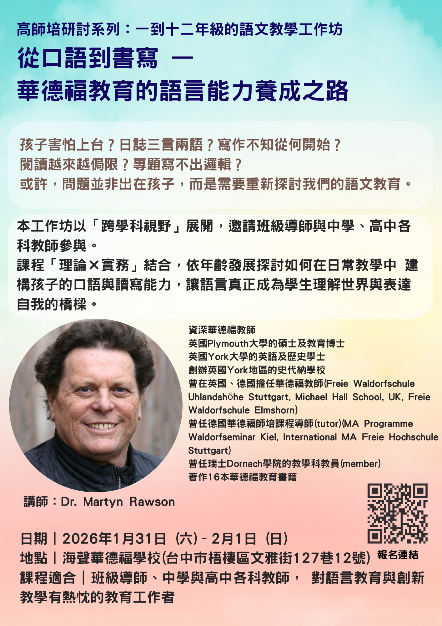 兩日課程由資深華德福教育者 Dr. Martyn Rawson 主講,適合關心語言教育、創新教學與學生整體學習發展的教育工作者參與。