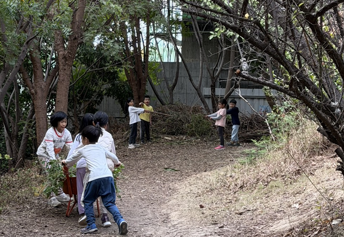 孩子們前往四格球區、小碎石區協助,看到十二年級姐姐修剪側門的枝葉,就動手搬運樹枝到芒果區;有人練習用大掃把清掃地面,也有人負責推著小推車載運落葉和樹枝。推車的工作太熱門,一度難以公平分配。只好嘗試老師的點子——每人輪流推20秒。但孩子們並不因此閒置自己:輪到推車的人專心控方向,後面會有人一起出力,2側還有人扶車給予平衡,也有人負責陪伴數數。這群孩子就這樣和諧地完成任務。到了下一次,再遇到需要運送樹枝葉子的時候,他們甚至自行分工,還創造出「交通指揮員」的角色,協助推車路線的順暢。