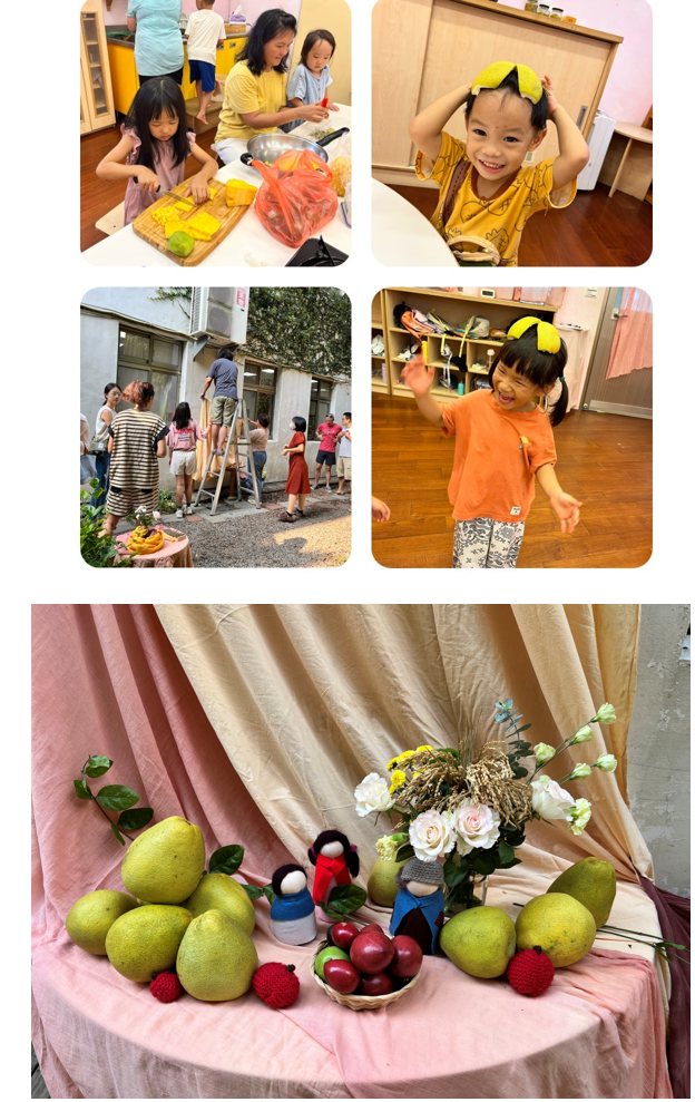 這幾週,孩子們唱著心智老師所寫的歌,《八月十五》;聽著老師講述《三個農夫》的故事;晨圈主題是《月娘》;烹飪活動,方琪老師帶領我們做了月餅、鳳梨酥、熬煮果醬…。老師也透過教室的環境佈置、帶領孩子製作手工,秋天、慶豐收的意味越來越濃厚,孩子們紛紛期待著『中秋慶典』的到來。為什麼呢?因為,可以帶回自己和爸爸媽媽一起製作的豐收袋,還有還有,可以帶回月餅跟果醬!孩子們單純又直接的反應,真是可愛!這年紀的孩子,果然跟“吃”最有連結!這也讓我想到,校長曾經所說的:『慶典,就在餐桌上。』